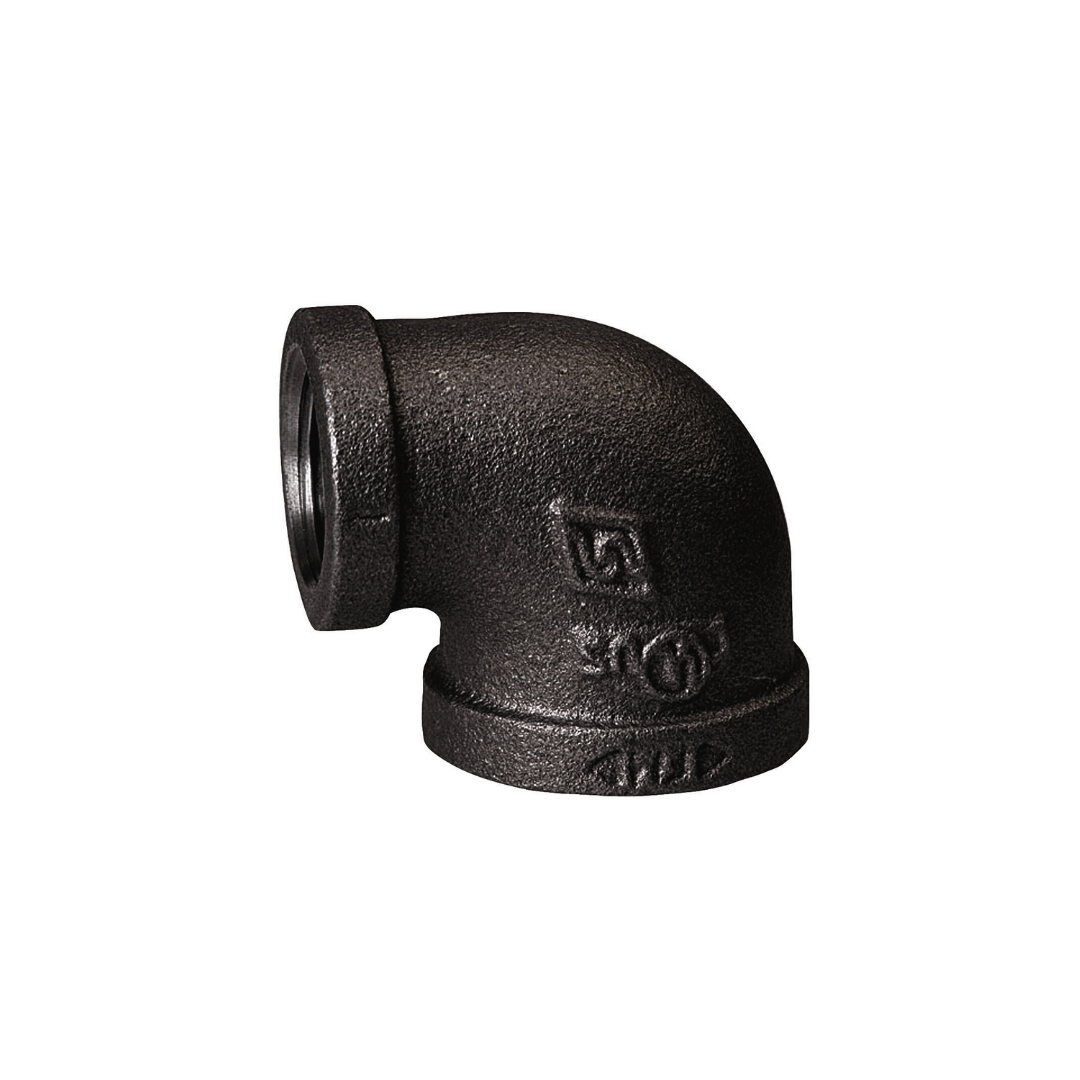 Codo reducido de acero negro de , ideal para cambios de dirección de 90° en tuberías, resistente y duradero.