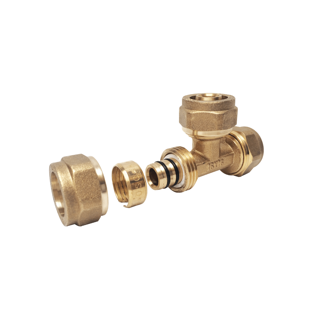 Tee en bronce 1/2″ 16 x 16 x 16, conexión duradera para tuberías multicapa. Ideal para derivaciones en redes de gas, agua o calefacción.