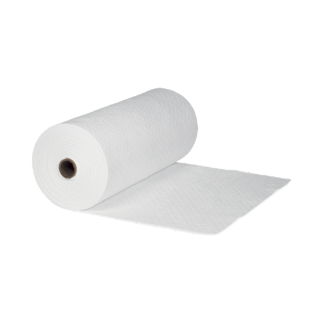 Tela oleofílica pesada en rollo de 45 mts. Absorbe aceites y derivados sin retener agua. Ideal para control de derrames industriales.